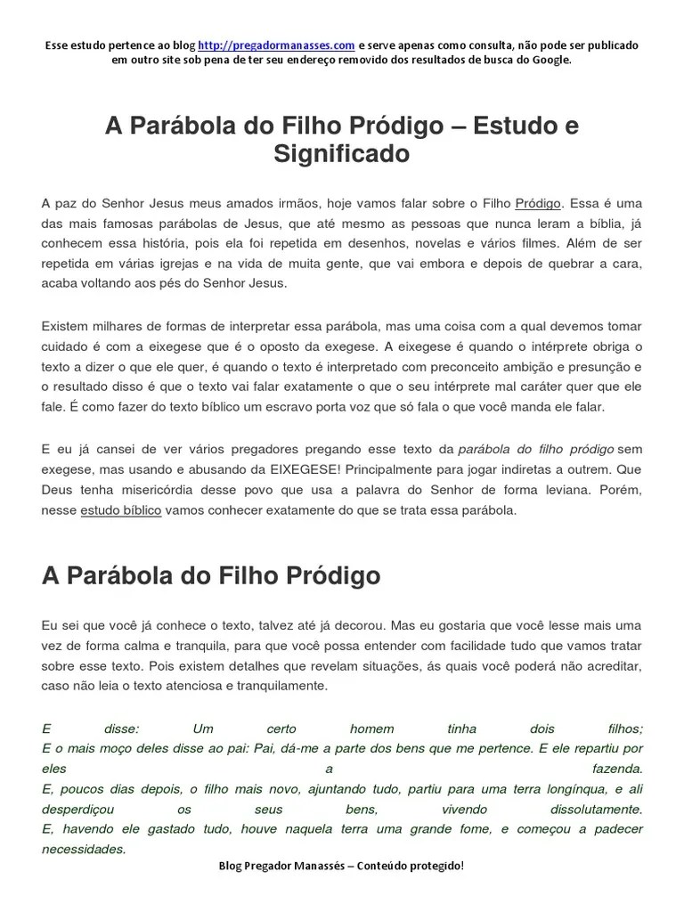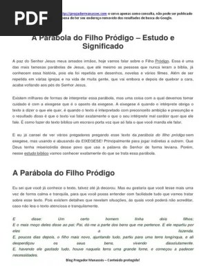 Idéias Esboço De Pregação Filho Prodigo. Os melhores esboços de pregações prontos para pregar. Novembro 22nd, 2014 às 11:47 am. A paz meu querido parabéns pelo ótimo trabalho do seu blog em divulgar seus abençoados livros em pdf tenho o link de seu blog guardado em meu face book nas minhas conversas com meu filho.gostaria muito mesmo de poder tb fazer um blog como o teu mas não sei ainda como por os livros nele ja faz muito tempo que tenho um blog mas não mexo com ele ja faz uns 9 pra dez anos então ja … Mar 09, 2017 · e muitos outros exemplos poderiam ser adicionados, como estes: Navegue através desse arquivo de esboços de pregação, e escolha o esboço de pregação da vida cristã, ou qualquer outro tema de sermão que você deseja pregar, e/ou ensinar.